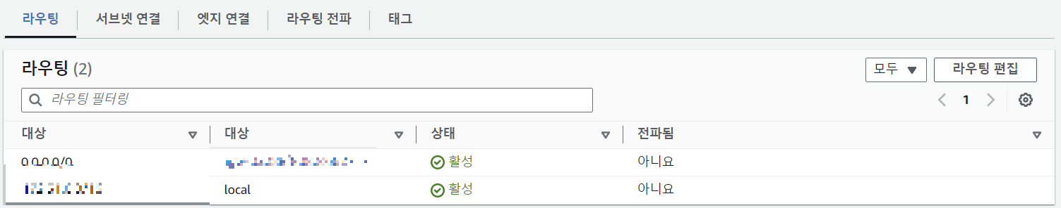 라우팅 테이블 상세 화면에서 [라우팅] - [라우팅 편집]을 클릭한다.