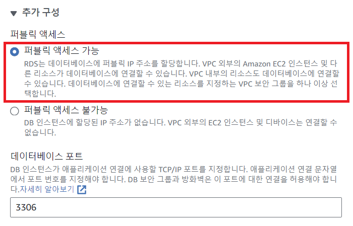 1. '퍼블릭 액세스 가능'으로 설정 (RDS 데이터베이스 설정)