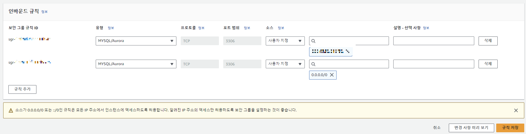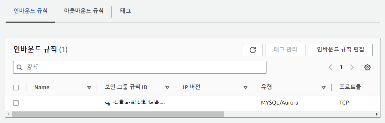 해당되는 DB의 보안 그룹 상세 화면에서 [인바운드 규칙] - [인바운드 규칙 편집] 을 클릭한다.