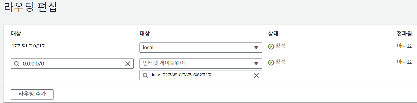 [라우팅 추가]를 클릭하고 첫번째 대상란에는 0.0.0.0/0을 입력하고, 두 번째 대상 란에서는 [인터넷 게이트웨이]를 클릭하면 자동으로 igw-xxxxxxxx의 ID가 입력된다.