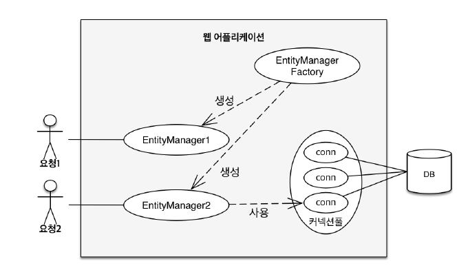- EntityManager1은 아직 DB 커넥션을 사용하지 않는데, 엔티티 매니저는 DB 연결이 꼭 필요한 시점까지 커넥션을 얻지 않는다. 보통 트랜잭션을 시작할 때, EntityManager2와 같이 커넥션을 획득한다.