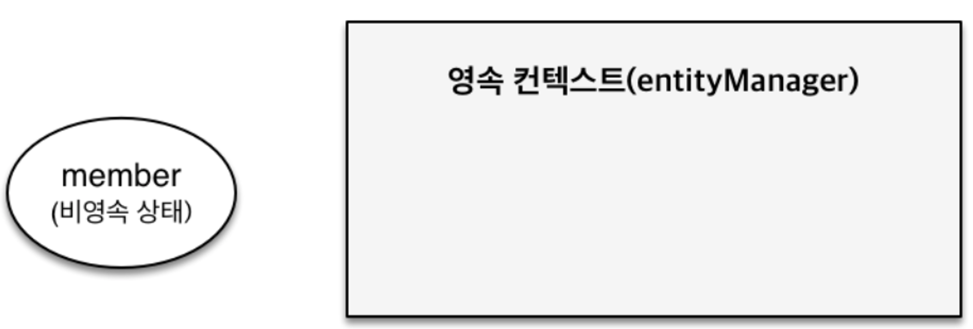 따라서 영속성 컨텍스트나 DB와는 전혀 관련이 없다. 이것을 비영속 상태라 한다(그림 2 참고).