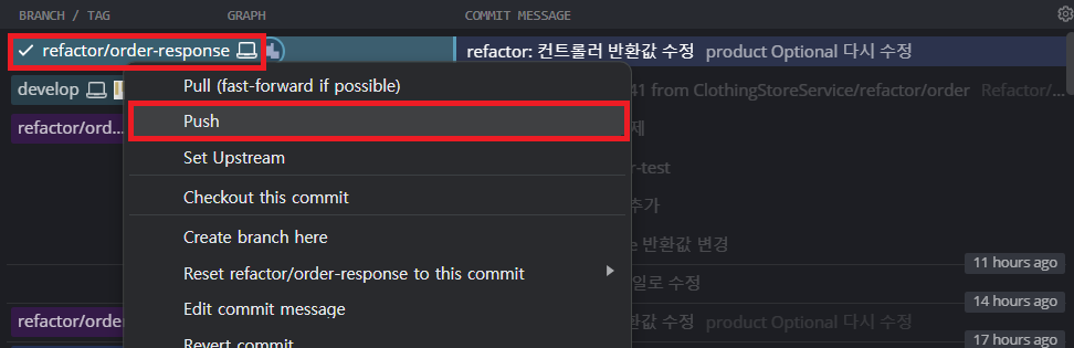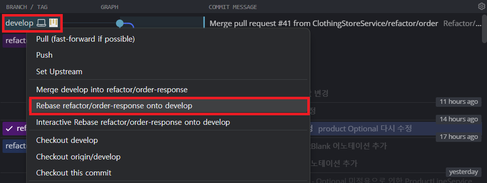 [develop] 우클릭 - [Rebase refactor/order-response onto develop] 클릭한다.