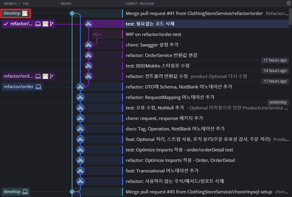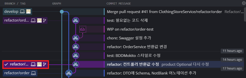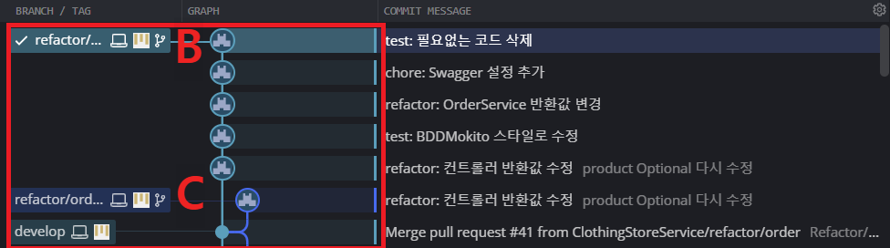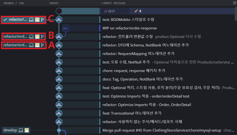 *refactor/order-response 브랜치가 B 브랜치에 해당한다.