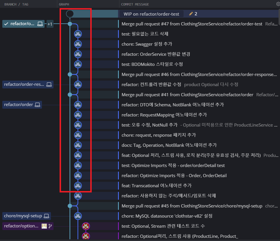 아래는 merge하기 전, GitKraken의 커밋 히스토리 상태이다.