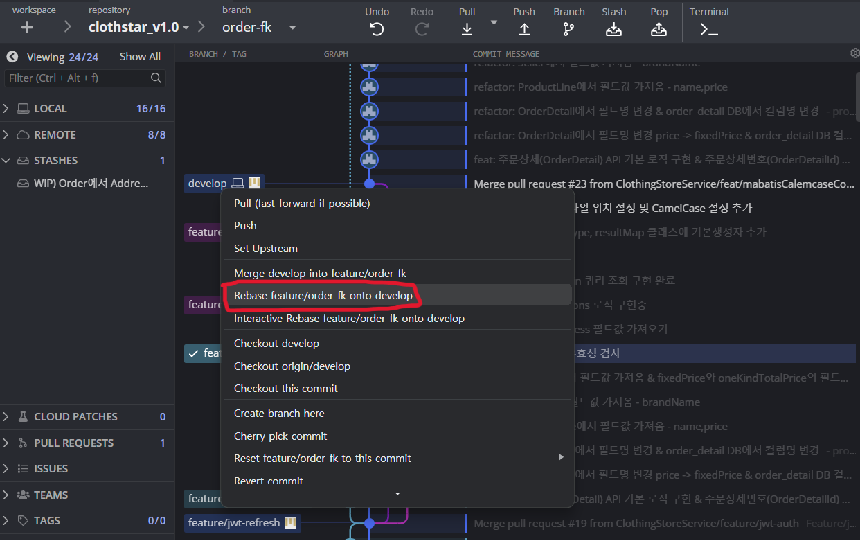 이후 [dev] 우클릭 - [ Rebase '내 브랜치 이름' onto develop ] 클릭 해주면 된다.