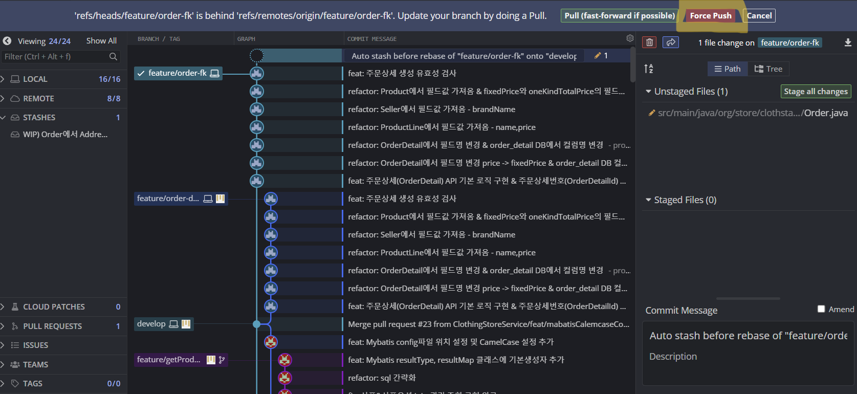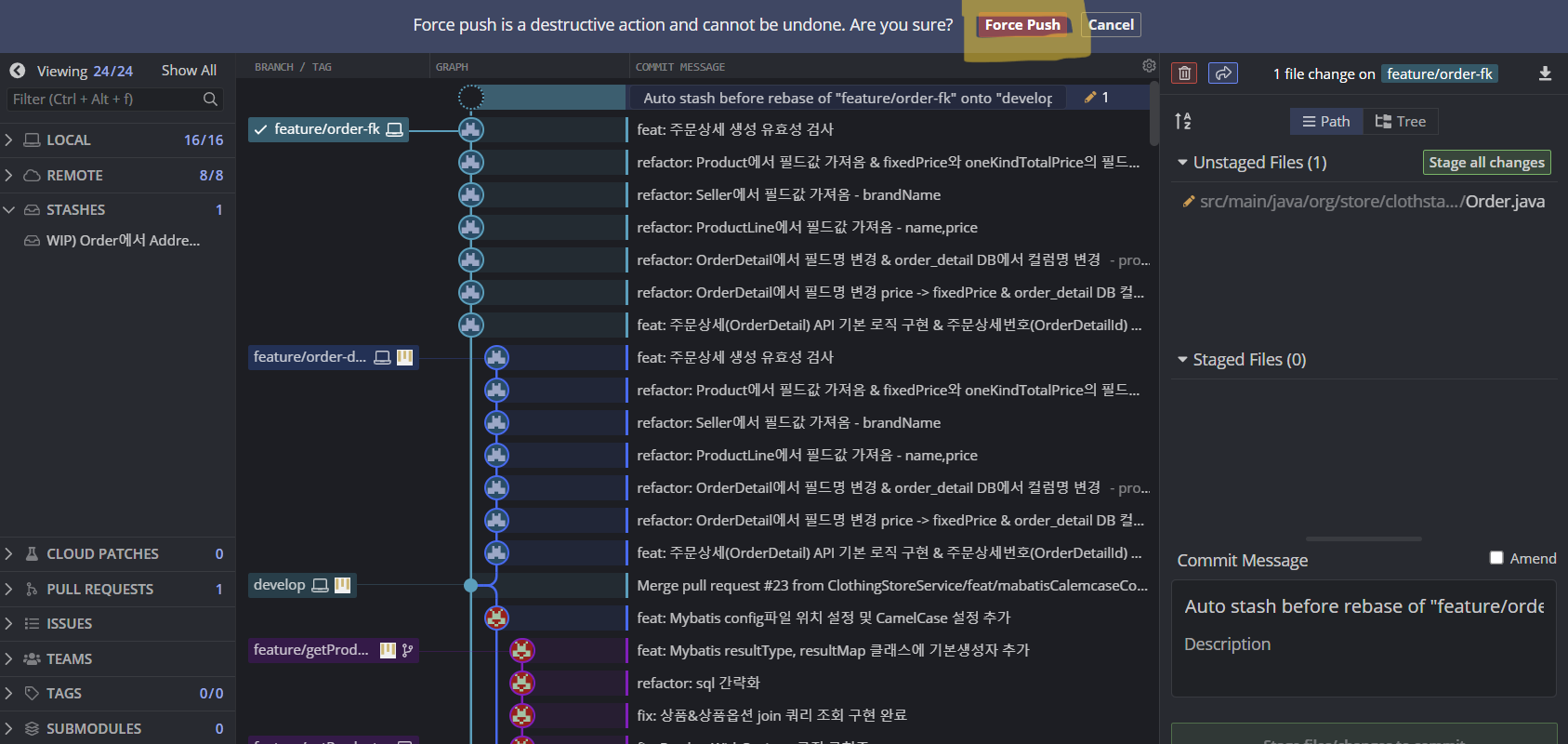 Rebase를 한 상태이므로 Force Push를 해주면 된다. 총 두 번 뜨는데 다 해주면 된다.