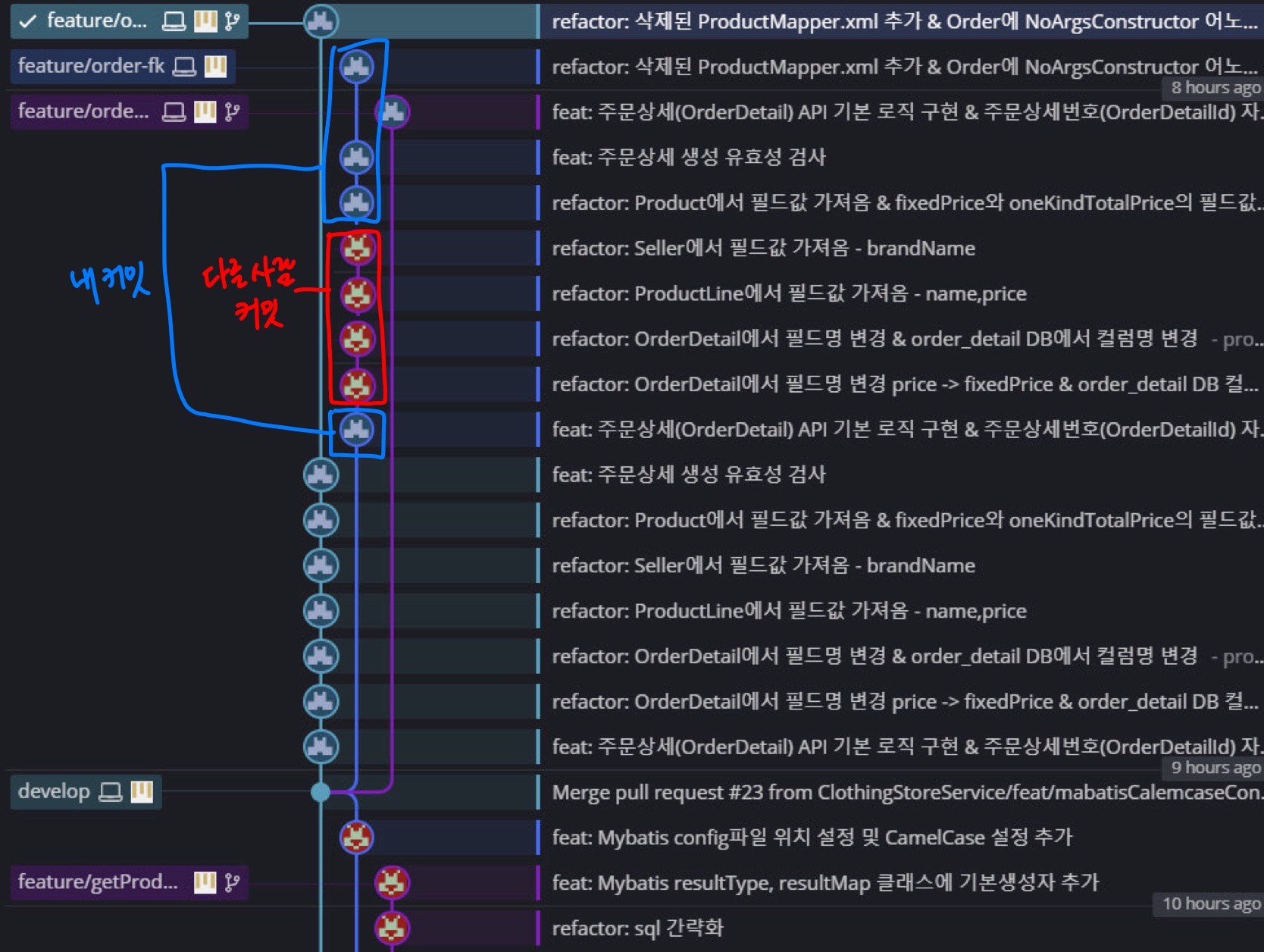 내 브랜치 안에서 커밋과 팀원분의 커밋이 섞여서 올라가게 되었다.